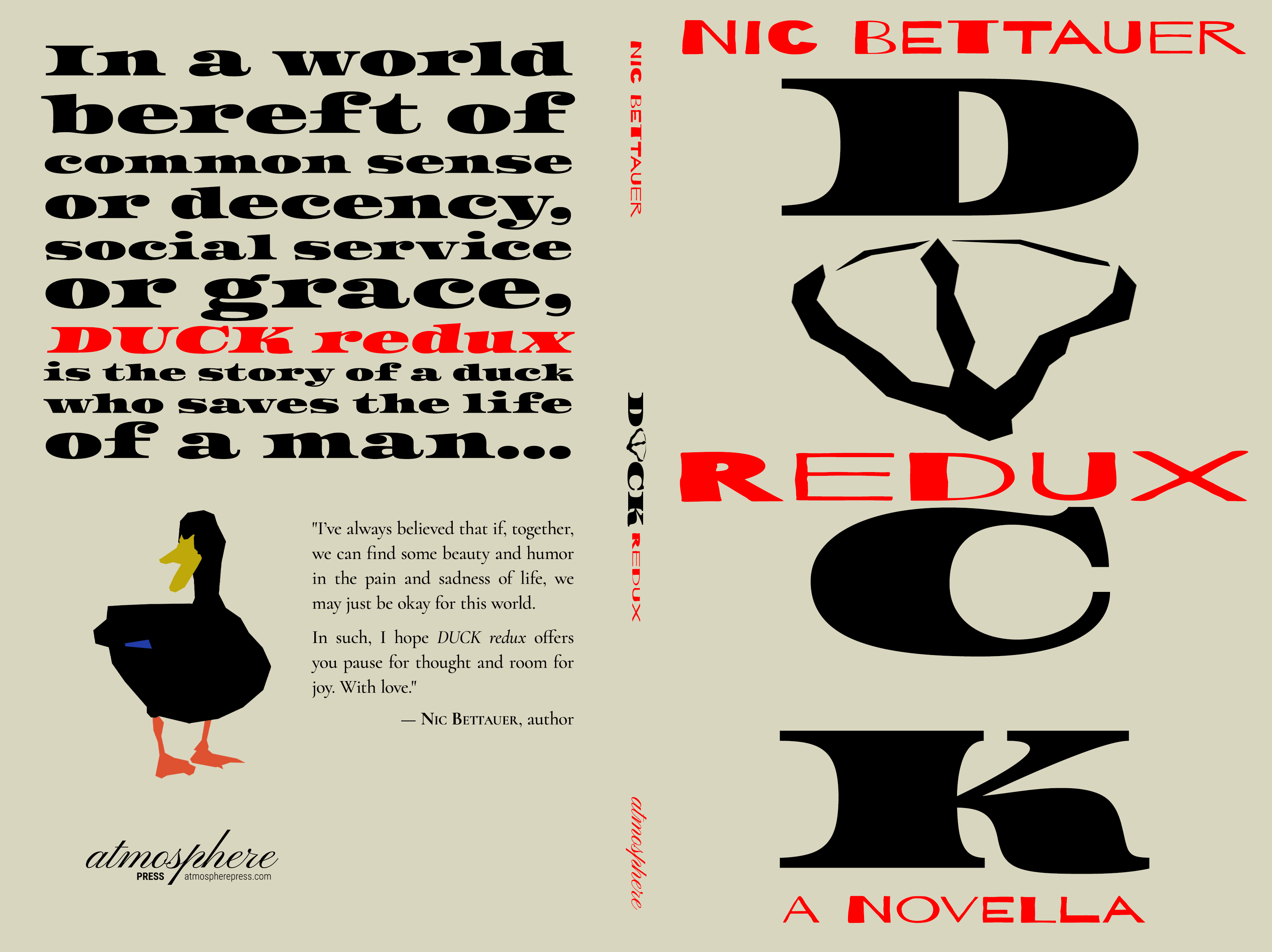 DUCK redux is both allegory and memoir, peopled and storied by Nic’s work as a volunteer crisis counselor in Los Angeles, helping and holding others’ pain. Set in a world bereft of common sense or decency, social service or grace, this is the story of a duck who saves the life of a man.